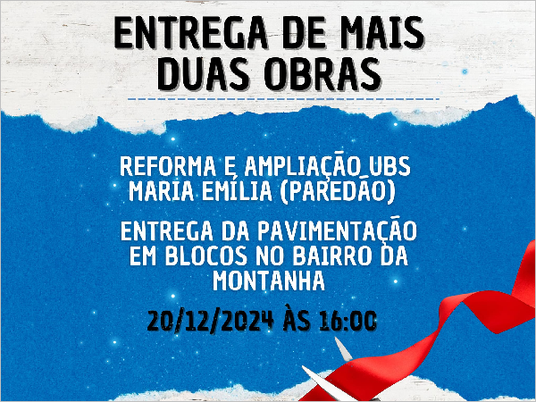 A Prefeitura Municipal de Ferreira Gomes no dia 20 de dezembro de 2024 às 16:00 horas, realiza a inauguração da entrega da reforma e ampliação UBS Maria Emília Batista Ferreira e ambulância no distrito do paredão. Destacando o essencial para garantir atendimento médico de qualidade aos moradores da região.